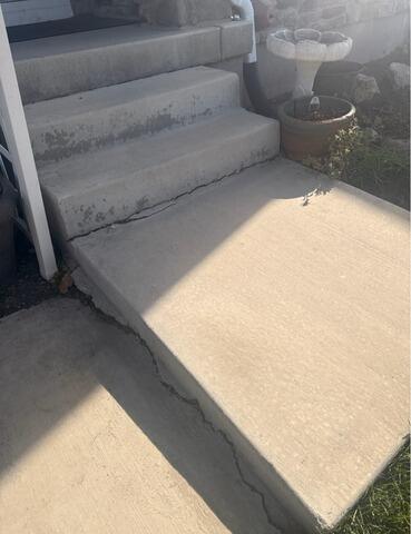 This before-and-after photo set showcases a concrete repair project completed at a residential home in West Jordan, Utah, where the front entry steps and walkway had settled and cracked over time. Soil movement beneath the concrete caused the steps to sink, creating uneven surfaces and visible separation that posed a safety concern.