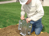 At each earth anchor location, a section of sod is carefully removed and placed aside to be returned later. Then a plastic sheet is laid down, and the hole is made with a power auger.